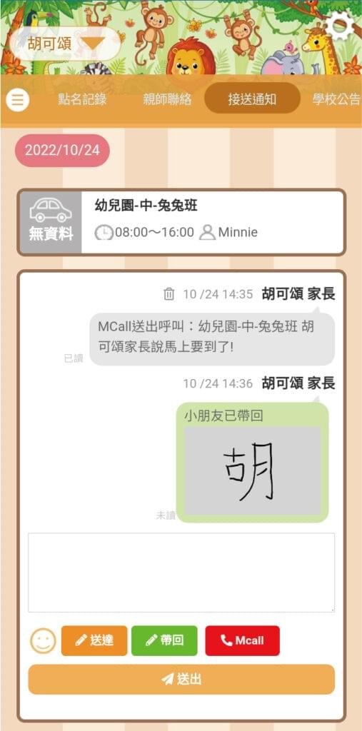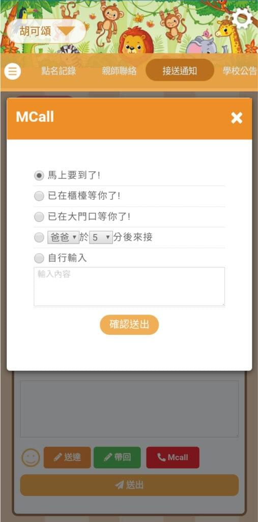 家長出發接孩子前,在手機Mcall輕按一下,呼叫櫃台老師。